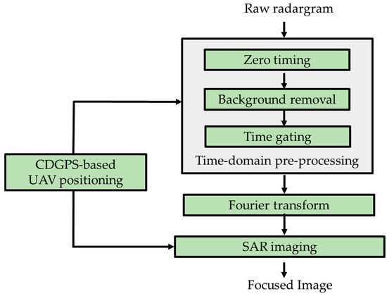 This section describes the signal processing strategy adopted to process the data collected by the radar system. The various stages of the data processing are summarized in the block diagram of Figure 2. According to this scheme, the input information is the raw radargram (B-scan) collected by the radar, which represents the received radar signal collected at each measurement position (along the flight path) versus the fast-time (i.e., the wave travel time). The final output of the reconstruction procedure is a focused and easily interpretable image depicting the scene under test.