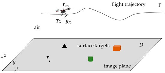 Let us refer to the 3D scenario sketched in Figure 3. The ultra-wideband radar transceiver onboard the UAV illuminates the scene with transmitting and receiving antennas pointed at nadir (down-looking mode), i.e., at a zero incidence angle with respect to the normal to the air–soil interface. The radar can be considered operating in monostatic mode, since transmitting and receiving antennas have negligible offset in terms of the probing wavelength. At each measurement point along the flight trajectory , the transceiver records the signals scattered from the targets over the angular frequency range . Therefore, multimonostatic and multifrequency data are collected.