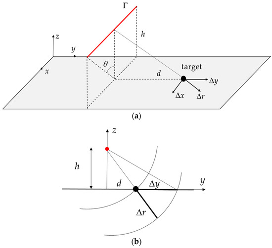 Let us consider the geometry sketched in Figure 5, where the UAV moves at a fixed height h following a rectilinear trajectory directed along the x-axis. The along-track resolution is determined by the central frequency of the radar and the maximum view angle fixed by half-length of the synthetic aperture [32]: