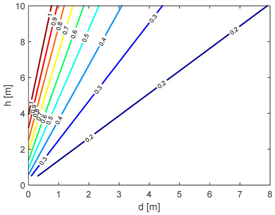 Figure 6 depicts the across-track resolution as a function of the target offset and the flight altitude . The contour plot has been produced by applying Equation (9) and considering the bandwidth of the radar system (i.e., ) introduced in Section 2.