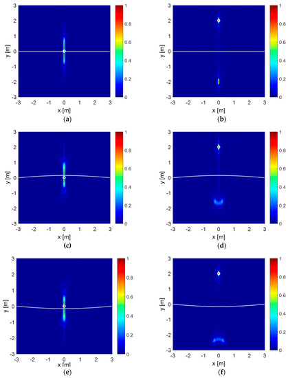 Table 5 reported below compares the true and reconstructed targets’ positions achieved in each image plane. The maximum of each spot in the images of Figure 14a–c is considered as the estimate of the targets’ positions. Note that the ± sign appears in the presence of the left–right ambiguity problem.