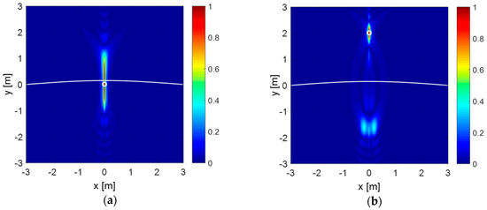 Figure 7 provides an example of the PSF computed according to Equation (5) by considering an investigation domain , which is discretized by square image pixels with size m, and two different values of the target offset (i.e., m and m). The scattered field data are sampled evenly with m step along the trajectory at a flight altitude m.