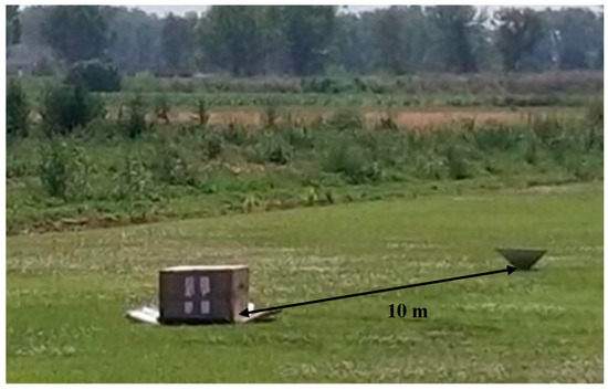 The M-UAV radar imaging system has been experimentally tested at an authorized site for amateur UAV testing flights in Acerra, Naples, Italy. The experiment aimed at testing the ability of the CDGPS technique to estimate the UAV position with the accuracy required for target imaging and, thus, to verify the capability of the overall radar imaging system. The experiment was carried out during a sunny day with a weak wind state. Two metallic trihedral corner reflectors, having a size and referred as Target 1 and Target 2, were used as on-ground targets placed at a relative distance of one from the other along the flight direction; one of them (i.e., Target 2) was covered with a cardboard box (see Figure 9).