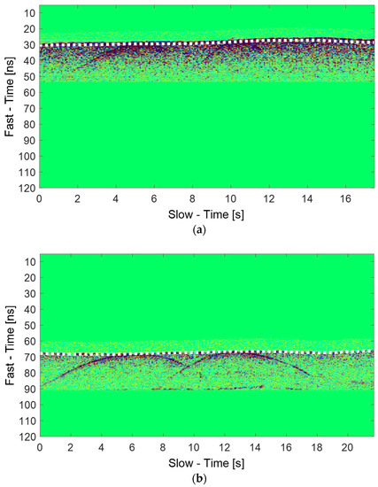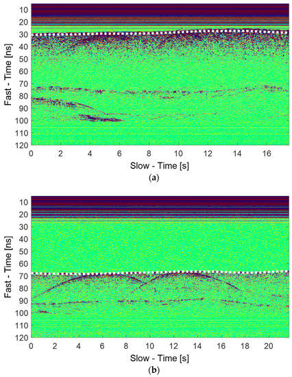 The raw radargrams, i.e., the data collected during the two surveys, are depicted in Figure 10a,b while the filtered radargrams (after the time domain pre-processing stage) are given in Figure 11a,b. It is worth pointing out that the horizontal axis shows the slow-time, i.e., the duration of the flight in seconds, while the vertical axis is the fast-time, i.e., the observation time window during which the data are gathered for each radar position, once that the time-zero correction has been performed. The fast-time is expressed in nanoseconds. The white dotted line represents the air/soil interface achieved by converting the variable UAV flight altitude estimated by the CDGPS into an equivalent travel time by using the formula .