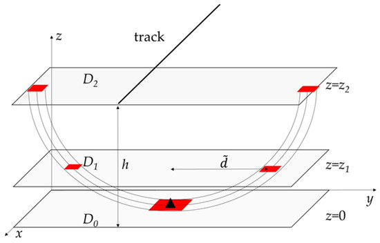 If the image plane coincides with the plane where the target is located, i.e., , the target is reconstructed at the correct position. When the image plane is different from , i.e., or due to the cylindrical symmetry of the 3D target reconstruction, the target is imaged at a position different from the true one in the considered plane. The position of the reconstructed target is equal to the intersection point between the 3D reconstruction and the plane where the imaging is carried out. Furthermore, due to the left–right ambiguity, two specular targets appear on both sides of the track (see red rectangles on planes or ). The spatial offset in the x–y plane between the true target and the reconstructed one for an image plane at a height can be derived after straightforward geometrical considerations and is given by