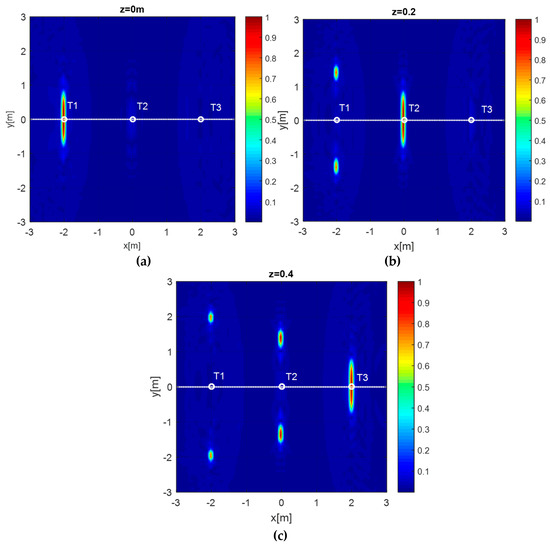 A numerical example showing the effect of the elevation of the image plane is presented in the case of a multi-target scenario. Specifically, the example refers to the rectilinear trajectory and simulation parameters already considered in Section 3.2. The scene comprises three point targets T1, T2, T3 aligned along the flight track and located at coordinates: (−2, 0, 0) m, (0, 0, 0.2) m, (2, 0, 0.4) m. The reconstructions results achieved on three images planes at z = 0, 0.2 and 0.4 m are displayed in Figure 14a–c, respectively. As can be observed in Figure 14a, only the target T1 is imaged and correctly localized in the plane z = 0 m while the targets T2 and T3 are not detected because they are located above the image plane. When the image plane is fixed at z = 0.2 m, the target T2 is the only one to be correctly localized while T1 is imaged a different location with a spatial offset with respect to the true position. The target T3 is still not detectable because its elevation is greater than the height of the image plane. Finally, Figure 14c shows the reconstruction in the plane z = 0.4m. In this case, all targets are detected but only T3 is correctly localized.