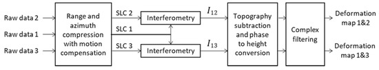 - Process the raw radar data for each of the three flight paths mentioned above (raw data 1, 2, and 3) according to the processing chain described in [10] and shown in Figure 3: range and azimuth compression with motion compensation; recording of the three resulting single-look complex (SLC) images; interferometry (SLC 1 with SLC 2, generating the interferogram 1 and 2, and SLC 1 with SLC 3, producing the interferogram 1 and 3); topography subtraction and phase to height conversion; and complex filtering. The output consists of two deformation maps, plus the three SLCs, all in slant range geometry. Each interferogram is calculated from the SLCs with 0.1-m resolution in azimuth and 1 m resolution in the slant range. Complex filtering results on a final spatial resolution of 3 m in both slant range and azimuth directions for each deformation map.