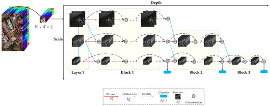 In sample extraction, we extract cube with the size , where W and L are the spatial size and the number of spectral bands, respectively. Each cube is extracted from a neighborhood window centered around a pixel, and the label of each sample is that of the pixel located in the center of this cube. Then, we feed 3D cube into the multi-scale dense networks model, which is itself composed of one convolution layer and three blocks, to obtain the classification result.