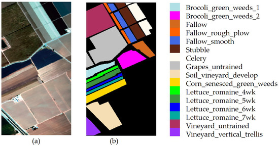 The Salinas Valley image was captured by the AVIRIS sensor over Salinas Valley, California, and is characterized by 3.7 m spatial resolution. It consists of pixels and 224 spectral bands and 0.4–2.5 m wavelength range, where twenty water absorption bands (108–112, 154–167, and 224) were removed. The reference image contains 16 land-cover classes. Figure 7a,b shows the true color composite of the Salinas Valley image and the corresponding reference data.