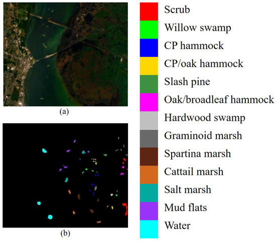 The KSC image was recorded by the AVIRIS sensor over the KSC site in Florida, with 18 m spatial resolution and 0.4–2.5 m wavelength range. After removing water absorption and low signal-to-noise-ratio (SNR) bands, the remaining 176 bands and pixels are used for assessment. Training data were selected using land cover maps derived from color infrared photography provided by the KSC and Landsat Thematic Mapper (TM) imagery. The vegetation classification scheme was developed by KSC personnel in an effort to define functional types that are discernible at the spatial resolution of Landsat and these AVIRIS data. Discrimination of land cover for this scene is difficult due to the similarity of spectral signatures for certain vegetation types. For classification purposes, 13 upland and wetland classes representing the various land cover types that occur in this scene were defined for the site. Figure 8a,b shows the true color composite of the KSC image and the corresponding reference data.