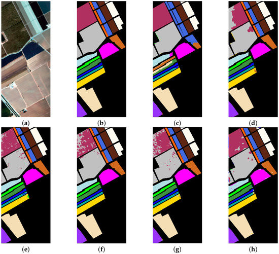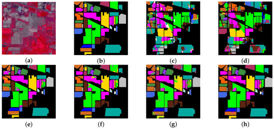 Classification maps of Indian Pines dataset. (a) False color image. (b) Reference image. (c) MLRsubMLL. (d) SVM-MLRsub-MRF. (e) R-VCANet. (f) SSRN. (g) MSDN-SA. (h) ASU-3D/2DNets.