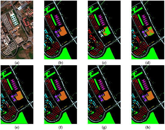 Classification maps of Pavia University dataset. (a) True color image. (b) Reference image. (c) MLRsubMLL. (d) SVM-MLRsub-MRF. (e) R-VCANet. (f) SSRN. (g) MSDN-SA. (h) ASU-3D/2DNets.