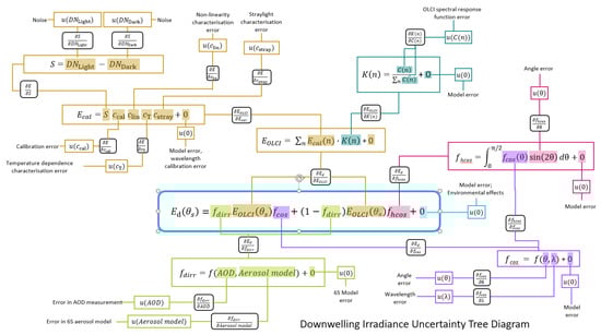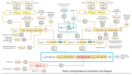 Figure 2 and Figure 3 illustrate the error contributions for the measurement equations for downwelling irradiance and water-leaving radiance respectively. These diagrams were first designed in the Horizon 2020 FIDUCEO project [] to show the sources of uncertainty from their origin through to the measurement equation. The outer labels describe the effects which cause the corresponding uncertainty.