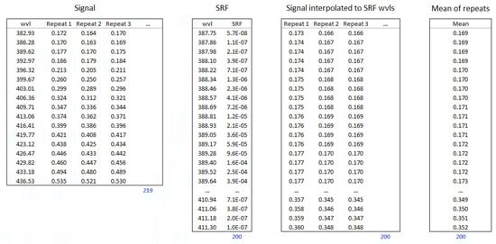 Description aid for the process of interpolating the signal values to the SRF values and finding the mean of the repeats. Note that this is for one band only; each band will have its own set of tables. The blue number below each table shows how many rows that table has.