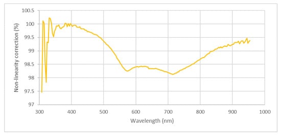 The integration time used when capturing the measured spectra can lead to non-linearity effects in the results. The maximum value of non-linearity effects was determined in the indoor calibration for the two radiance instruments, but not for the irradiance instrument []. As the principal aim of this study is to outline the method and only secondary provide results, the radiance instrument corrections are used for the irradiance instrument. The non-linearity correction values are provided for all instrument wavelengths. Similarly, to the instrument signal, in order to align with the OLCI bands, the only non-linearity values used are those whose wavelengths overlap with the SRFs of each of the seven OLCI bands. These are then interpolated to match the 200 OLCI SRF wavelengths. The interpolation method chosen was linear interpolation due to the smoothness of the non-linearity correction curve (see Figure 5).