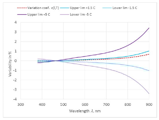 Variation in calibration coefficients as a function of wavelength for a range of temperatures for a RAMSES instrument, based on [].