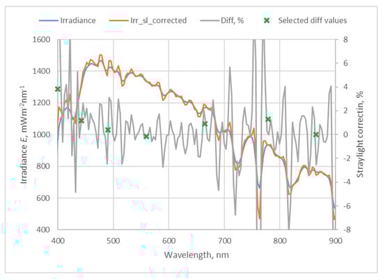 The stray light correction of the irradiance measurements and the percentage difference between non-corrected and corrected. The selected values are calculated using a weighted interpolation technique.