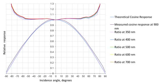 - Mekaoui, S.; Zibordi, G. Cosine error for a class of hyperspectral irradiance sensors. Metrologia 2013, 50, 187–199. [Google Scholar] [CrossRef]