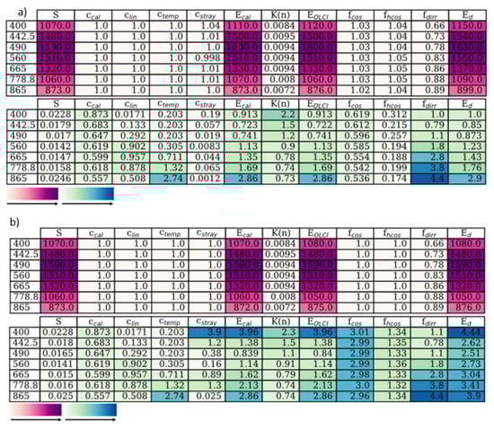 The colour coding of the error contributions presented in Figure 2 and Figure 3 can be treated as the classification of the errors due to instrument, environment and applied modeling, although that classification in not always straightforward. All yellow highlighted boxes in both figures represent a class of instruments related contributors related to instruments signal, S, absolute radiometric calibration, , and instruments characteristics such as temperature, , detector linearity, , spectral stray light, etc. In addition in Figure 2 pinkish boxes address the errors related to the cosine diffuser angular response. The turquoise box represents the spectral band convolution step, thus this can be classified as modelling class as uses the satellite spectral response function. For the irradiance case the green box represent the fraction of the direct to total irradiance and this is an example where the environmental and modeling errors contributions are tangled together, as some input to the model uses environmental condition such as actual value of AOD (see Section 2.5.10 for more details). Similar situation applies to the red box in Figure 3, for water-leaving radiance to estimate Fresnel reflectance values, this is again a combination of environmental errors such as wind speed and modeling errors that are used to derive this value. Blue box, in both figures, with term represents a placeholder for any other environmental effects that are not fully accounted for in the current version of the uncertainty budget, this can be the structure shadings effect.