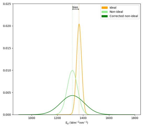 (ii) For the non-ideal case, no correction is applied. The assigned distribution is a Gaussian distribution with mean equal to 1 and standard deviation equal to the fitted polynomial stray light correction (see Figure 7 and Table 2) at the seven OLCI bands of interest.