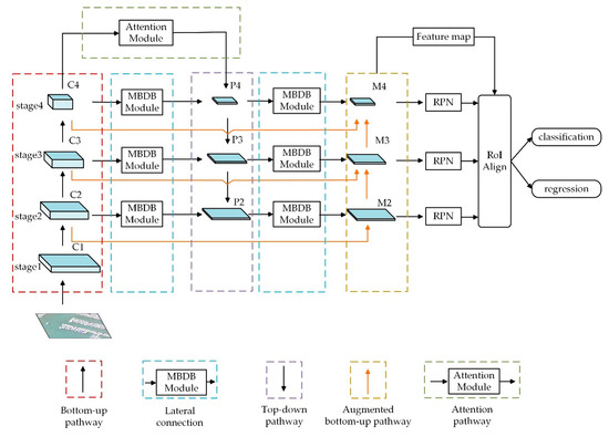 For the top-down pathway, we first simply attach an MBDB module on C4 to generate a coarsest resolution map P4. Then, factor 2 is used to conduct spatial resolution up-sampling on the produced feature map P4. Finally, we merge the up-sampling map with its corresponding bottom-up map that has attached an MBDB module as the lateral connection. Note that we use nearest neighbor up-sampling for simplicity and element-wise addition for merging here. Repeating this process until the finest resolution map is produced. The final set of feature map can be signed as {P2, P3, P4}, which with the same spatial sizes corresponding to {C2, C3, C4}, respectively.
