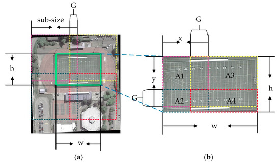 In remote sensing images, when these are many large images, we may split them into small chips to alleviate the computational and memory cost. Generally, a constant sub-size of sub-images and a constant overlap (G) are set to divide the image from left to right and top to bottom of the original image into smaller sub-images. An example of the split process is depicted in Figure 5a. From Figure 5a, the green box denotes one object in the image; h and w denote the height and width of this object, respectively. When the height and width of the object are less than the sub-size (such as 800 or 1000 pixels), the object can be divided into up to four parts and each part exists in a different sub-image (denoted by the pink, blue, yellow and red dotted boxes respectively). We can call these parts as sub-objects and two adjacent parts intersect each other. The overlap value of two sub-objects is the same as that of the sub-images and denoted by G.