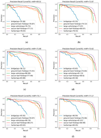 The precision-recall curves of the 5 object classes in Table 2 are shown in Figure 6. These 5 categories are selected from all 16 categories and they have a visible distinction in performances between network architectures. The recall rate assesses the ability to detect more objects, but the precision measures the ratio of correct objects to all detected objects. Therefore, as the curve decreases sharply, the higher the recall rate, the better the detection effect of the class. Due to the high similarity between the object and the background, and the lack of training samples, the container cranes are poorly recognized in the FPN and the proposed method can promote the detection effect to a certain extent. For each combination (FPN+MBDB, FPN+AP, FPN+ABUP), the small objects (such as small vehicles) and the large objects (such as ground track field) both get better detection results. From Figure 6e, for the presented EFPN, the recall curves of most object classes begin to decline sharply when the recall value exceeds 0.8. It is because the proposed EFPN has stranger semantic information extraction ability and nice detection performance.