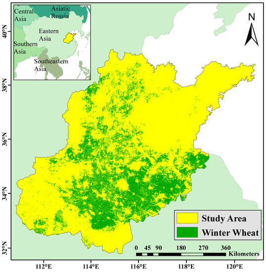 The NCP is the largest agricultural region in China (approximately 400,000 km2) and is the main wheat-producing region in East Asia. Our study area is a wheat–maize rotation cropping system with relatively adequate irrigation and fertilizer (Figure 1) []. In this area, winter wheat is sowed in October and harvested in June of the following year. Although most studies have concluded that climate warming has reduced global wheat production, the actual yields in the NCP have in fact increased over the past 50 decades [,]. The adaptation options and techniques could offset the negative impact of climate warming [,]. Due to the interaction between climate warming and non-climate effects, the phenological change in this region will be more uncertain in the future.
