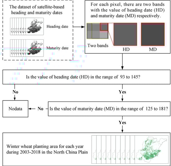 Most of the previous studies analyzed the change in wheat phenology with the assumption that the wheat planting area was unchanged during the research period [,]. However, this assumption could lead to a high uncertainty of estimated wheat phenology in each pixel. In this study, the winter wheat planting area for each year was extracted based on a simple decision tree method. Decision tree has been widely used in land cover classification and can improve our results [,]. A binary decision tree was built to distinguish the pure pixels of winter wheat from other pixels (the non-winter-wheat and mixed pixels). The estimated heading and maturity dates (HD and MD) have been specified as two phenological nodes (Figure 2). Based on observational ground phenology data and previous studies, the ranges of the estimated HD and MD were set between day of year (DOY) 93 and 145, and DOY 125 and 181, respectively [,,]. The pixel value should be within both of these ranges, otherwise it would be set to nodata.