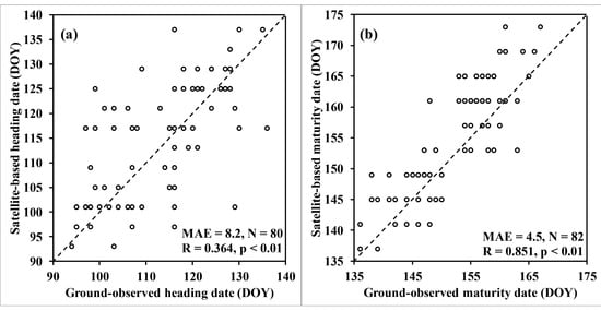 Comparison between the satellite-based and ground-observed heading date (a), and the maturity date (b) in the North China Plain.