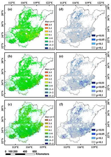 The changes in the HD (a), MD (b), and LRGP (c) during 2003–2018 at different significance levels (d–f). The gray pixels represent where the changes are not significant (p > 0.1).