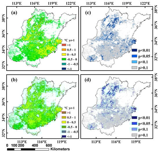 The changes in two-month mean temperature in March–April (a) and May–June (b) during 2003–2018 at different significance levels (c,d). The gray pixels represent where the changes are not significant (p > 0.1).