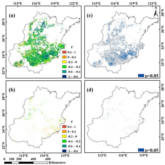 The Pearson correlation coefficients (r) of the March–April mean temperature with the HD (a) and the May–June mean temperature with the LRGP (b). There is corresponding significance at the 0.05 statistical level (c,d). The gray pixels represent where the correlation is not significant (p > 0.05).