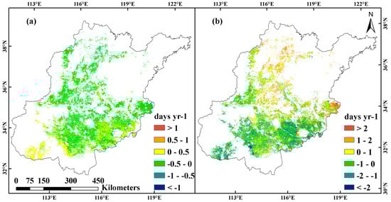 where (days/year) represents the change in the LRGP only under the impact of non-climate effects, (days/year) represents the satellite-observed phenological trend of the LRGP, (days/°C) represents the mean temperature sensitivity of the LRGP determined by crop models in previous studies, which could be stable and representative across the NCP [,], and (°C/year) represents the change trends of corresponding mean temperature. The result showed that the impact of climate warming on the LRGP had changed by –0.1 ± 0.27 days/year during 2003–2018 with large spatial differences across the NCP (Figure 9a). Furthermore, the impact of non-climate effects on the LRGP had a mean changing rate of –0.2 ± 1.46 days/year (Figure 9b).