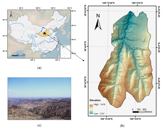 The study site is located in Ansai County, which is in the central part of the Loess Plateau, and belongs to the typical hilly–gully region (Figure 1a). The study area is part of the Zhifanggou catchment and covers an area of 2.33 km2 with varying elevation between 1131 m and 1416 m (Figure 1b). It has a semi-arid climate with mean annual precipitation of 528.5 mm and mean temperature of 8.8 °C [9,40,41]. The vegetation coverage has been extremely recovered due to the implementation of the Grain for Green Project since 1999 [7,9,10]. The dominantly tree species in the study area include Robinia pseudoacacia, Caragana intermedia, Hippophae rhamnoides, Sophora viciifolia, Artemisia gmelinii, Artemisia giraldii, Lespedeza davurica and Bothriochloa ischaemun [9,41]. This area has suffered serious soil erosion, which has generated many intensely developed bank gullies in the total area [9], which can be seen in Figure 1c.