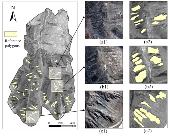 Delineated reference polygons of the study area. (a1–c1) are three subsets of the original landform, and (a2–c2) are the reference polygons