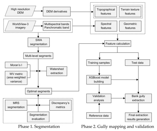 Current studies concerning gully feature extraction based on OBIA are mainly focused on gully-affected area extraction [12,14,15,16]. Although some studies started to get involved in mapping bank gullies [17], problems still remain and primarily appears as follows. Firstly, the segmentation techniques are usually carried out with region-based methods, e.g., the MRS method, which is parameter sensitive. Secondly, existing methods lack effective optimized strategies and prefer to use a global scale, with which it is difficult to achieve a satisfactory segmentation. Thirdly, the question of how to use a state of the art classifier and the information from high resolution data sets still needs to be explored further. Therefore, the objective of this paper is to develop an integrated approach, including multi-level segmentation generation, optimization and ML-based classification for mapping bank gullies using a UAV-based DEM and satellite imagery from WorldView-3. To fulfill this objective, the following contributions are made. (1) We combined the SWA method and a watershed-based unsupervised segmentation optimization strategy to achieve ideal segments. (2) We fine-tuned and trained the XGBoost model by integrating spectral information from WorldView-3 imagery and topographic information from the UAV-based DEM for bank gully mapping. The developed method is expected to provide potential information for controlling and monitoring gully erosion.