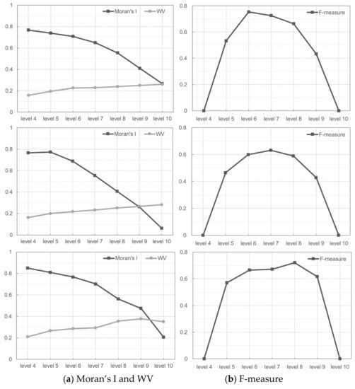 SWA produced 20 levels of segmentation results ranging from over-segmentation to under-segmentation at one time. As the segments of levels 1–4 and levels 10–20 were extremely over-segmented and under-segmented, the optimum segmentation level was considered to lie within levels 5–9. Then, the MI and WV measures and the combined metric F-measure were calculated based on multi-level results for each sub-watershed, and they are plotted as curves in Figure 5. To better display the variation trends of MI, WV, and F-measure, the results for levels 4 and 10 were also plotted. Due to the paper length limitation, only three sub-watershed calculation results are shown in Figure 5.