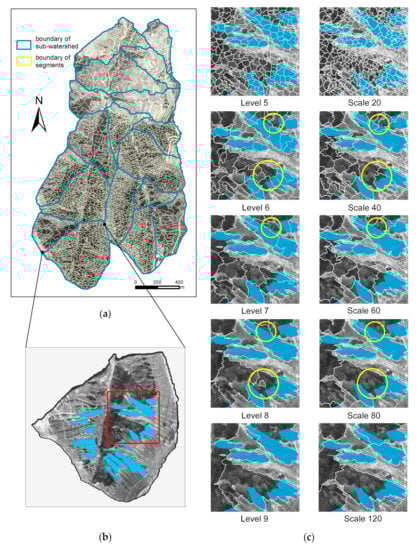 In this paper, the segmentation optimization strategy first regarded the watershed as the basic processing unit. After that, numbers of sub-watersheds were extracted by following steps. (1) Filled sinks: Sinks were filled based on the DEM [41]. (2) Stream network extraction: Grid-based networks were delineated on the basis of the flow direction calculated by using the D8 algorithm [42] and flow accumulation [41]. (3) Watershed extraction: Based on the flow direction matrix and stream network [43], watersheds were finally extracted with a 0.16 km2 threshold. This threshold was automatically determined by following the method of Wu et al. [44]. These processing procedures were fully implemented in the ArcHydro model so that the sub-watersheds could be easily extracted automatically. Finally, 18 sub-watersheds were extracted. Four of them were employed as the training area, and the remaining fourteen sub-watersheds were used for validation. Each sub-watershed had its own segmentation level.