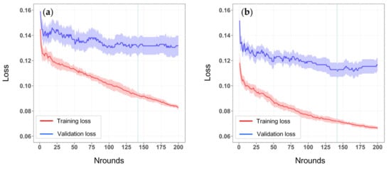 Loss graphs for the optimized XGBoost model. (a) Loss graph of the XGBoost model before fine-tuning with the default parameters; (b) Loss graph of the XGBoost after fine-tuning with the optimized parameters. The red and blue margins represent the corresponding standard deviations for the training loss and validation loss, respectively.