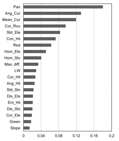 To present the feature importance ranking, we calculated the mean value of the MDG from 15-fold replicate runs, and the top 20 features were selected and presented in Figure 8. The terrain texture features dominated the feature importance ranking, with 14 features selected. This is because the GLCM-based terrain texture can fully consider the spatial relationship among pixels. This capability provides terrain texture a reliable basis for reflecting the assemblages of repeating patterns of landform elements [57]. GLCM-based terrain texture can be treated as a kind of second-order geomorphometric parameter. The use of these second-order parameters can enhance the ability of traditional topographic factors to distinguish different landform types. Therefore, terrain textures can better identify distinctions among different landforms at a certain scale than traditional topographic features [58]. Excepting terrain texture features, there was only one geometric and one topographical feature appearing in the ranking list, implying a minimal effect for these two kinds of metrics in improving the accuracy of bank gully extraction. As shown in Figure 8, the Pan feature ranked at the top position. This may be because the panchromatic band has 0.31 m resolution and the features obtained from higher resolution imagery are more important than those from the 1-m resolution DEM.