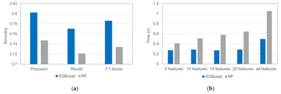 Comparing the mapping accuracy and processing time for XGBoost and RF. (a) Histogram of the accuracy assessment of the two methods, (b) Histogram of the processing time of the two methods, based on different feature numbers.