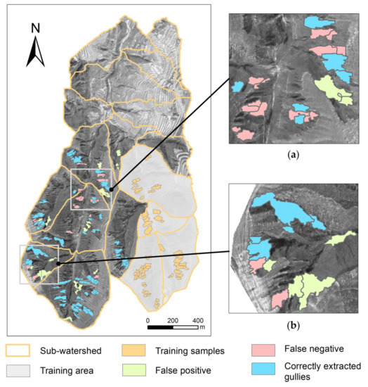 Bank gully extraction results. (a) False negative area which reflected the the omission area. (b) False positive area which reflected the commission area.