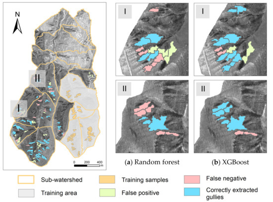 Bank gully extraction results of Random Forest. Two subsets are selected to illustrate the results of two methods: (a) Random Forest (RF), (b) XGBoost.