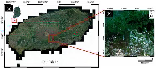 Study area: (a) Jeju island, Korea; (b) Kompsat-3 satellite ortho-rectified image acquired in the study area.