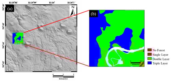 (a) Background topography of the study area; (b) a reference map of forest vertical structure classification produced by the field survey on 29 November 2018.