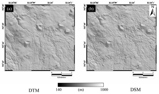 (a) Digital terrain model (DTM) (5 m) from the national geographic information institute (NGII); (b) digital surface model (DSM) from WorldDEM (12 m).