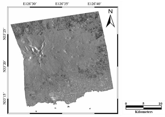 Finally, a total number of eight ALOS PALSAR-1 images were acquired in the descending orbit. Figure 4 shows the ortho-rectified ALOS PALSAR-1 power image. The PALSAR-1 raw data were preprocessed to create PALSAR-1 single look complex (SLC) images. Then, we generated 12 interferograms from the eight PALSAR-1 SLC images, as listed in Table 2. The incidence angle of the PALSAR-1 images was 38.7 deg, and the pixel spacing were about 3.15 and 4.68 m in the azimuth and range directions, respectively. The temporal and perpendicular baselines of the interferometric pairs are summarized in Table 2. An L-band ALOS PALSAR-1 image has a higher transmittance to objects due to a longer wavelength, so that it is able to preserve a higher coherence in forest areas than the X and C-band images [32]. Therefore, the L-band image is more suitable to classify the forest vertical structure rather than the X and C-band images.