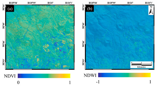 Input neurons of the multi-layer perceptron (MLP) artificial neural network (ANN) created from KOMPSAT-3 data: (a) normalized difference vegetation index (NDVI) and (b) normalized difference water index (NDWI) maps.