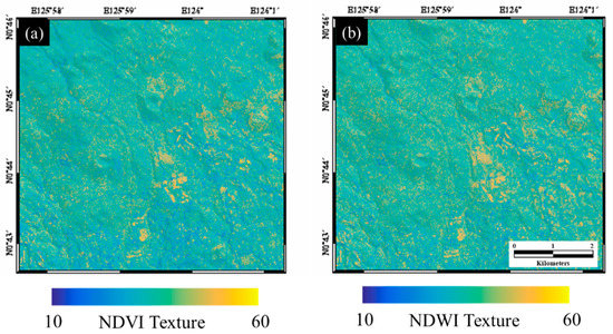 The NDVI and NDWI texture maps were, respectively, generated from the NDVI and NDWI maps using Equations (4) and (5). As you can see from Figure 7a,b, the smoother the index maps are, the higher the texture values are.